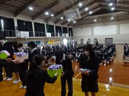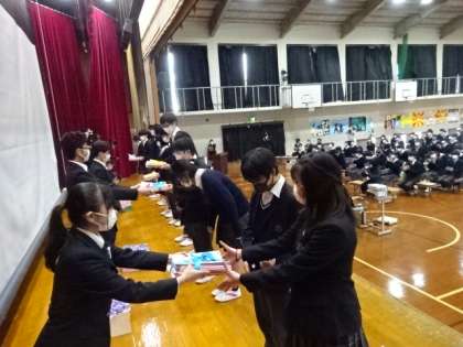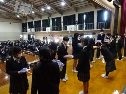 3年生へ、卒業式で付けてもらうコサージュと生徒会「旅立ち」冊子の贈呈をしました。