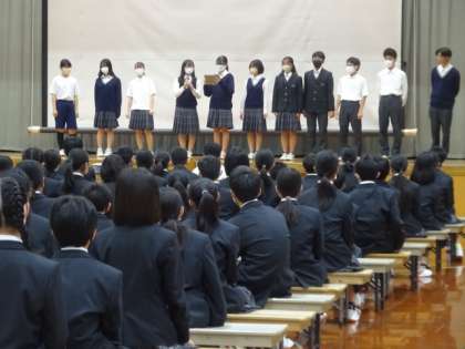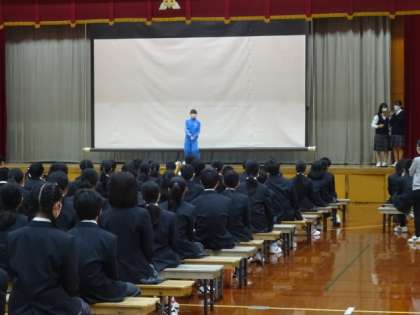 2年生・3年生から、新入生を迎えるにあたっての学年ビデオを作成し、オンラインで発表してくれました。また、生徒会執行部による加茂中ファッションショーで、制服の着こなしを説明してくれました。