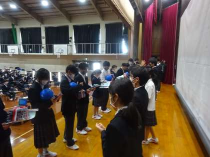生徒会執行部から1年生クラスに、昼休みグラウンドで使う学級ボールと学級旗の作成等に使うペンが渡されました。