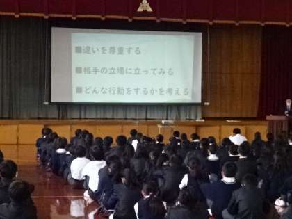 1年生学年集会で多様性を認めていく社会になる中で、中学校生活を送る中でも日常生活で考えてほしいこと、「心のバリアフリー」について話されました。「心のバリアフリー」とは、様々な心身の特性や考え方を持つ「すべての人」が笑顔で暮らせるように、わたしたち一人ひとりが相手の気持ちになって考え、行動し、支えあうこと。お互いが助け合うことの大切さ。