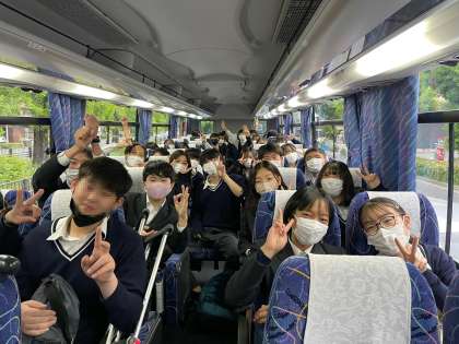 修学旅行が始まりました。朝早くの集合、そして出発でしたが、バスの中では笑い声がたえません。これからこの3日間を通じて、さまざまな経験を積み、学びを深めてほしいと思います。
