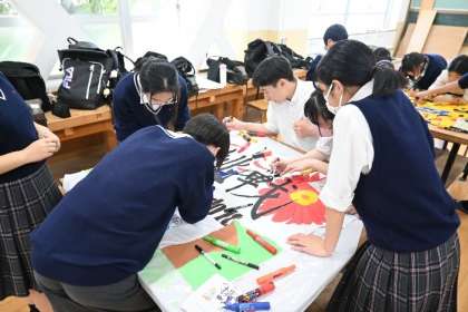 懇談の裏で、生徒たちは学級旗制作に取り組んでいます。色ペンやマーカーを使って、有志のメンバーで楽しそうに塗ってくれています。