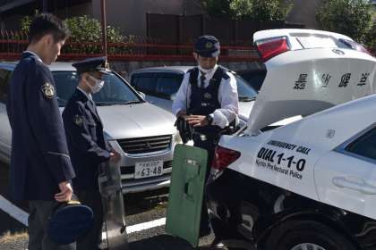 パトカーの中に入っている装具を説明してもらい、実際に装着させてもらいました。