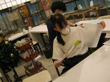 店員さんの指導をしっかりきいて、実践。わたくしたち、仕事、しています。