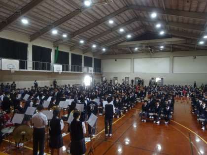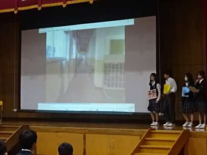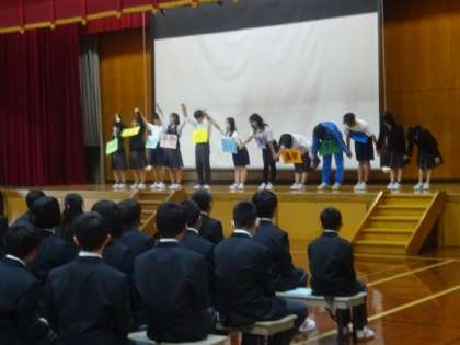 吹奏楽部の演奏で、新入生が入場しました。生徒会執行部のメンバーで映像を使いながら学校紹介をコメディータッチで行ってくれました。
