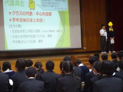 第76期生徒会スローガン「RISE TOGETHER〜新しい景色へ共に〜」の紹介に始まり、カモくん・カモちゃんが登場し、各種委員会の取組について紹介してくれましたカモ〜。