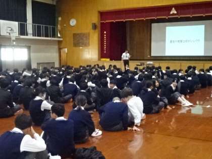 2年生ではじめて道徳の時間に、体育館に学年生徒が集まり一斉に学年道徳を行いました。