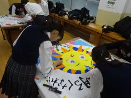 二者懇談の期間で、各クラスで検討したデザインで学級旗を作成しました。