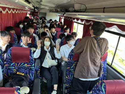 誰が一番に手を挙げたかの判断、バスレク係が悩みながら…みんな楽しんでます。移動時間を忘れるくらいみんなで盛り上がってます。