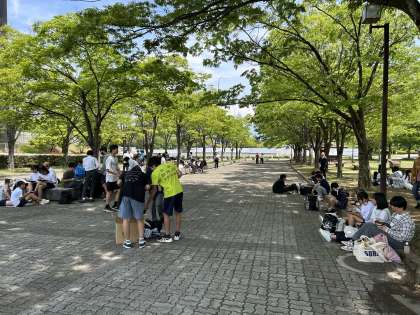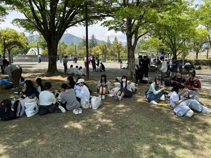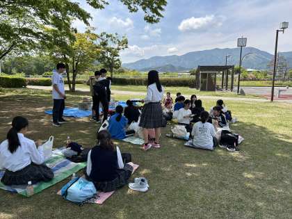 クラスに分かれて、木陰での昼食です。