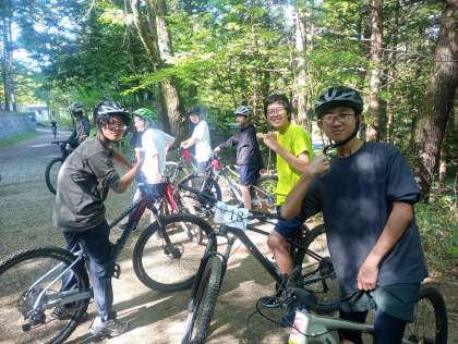 マウンテンバイクは、乗り方をレクチャーしてもらった後、急な坂道の上にある2km程の林間コースをみんなで周回する流れでした。が、初めの坂道から急で、心をへし折られた女子もいました。ただ、ゆっくりとそれぞれのペースで周回を重ねるごとに段々上手く走れるようになり楽しむことが出来ました。