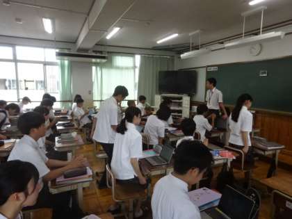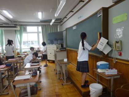各々が、授業の準備や先生との話に時間を使っています。黒板消しの当番さん、ありがとう。