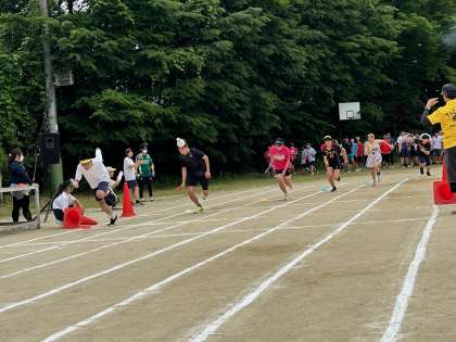 部活動対抗リレーでは、各部活動をしっかりアピールしてくれていました。飛び入りで教職員チームも出場