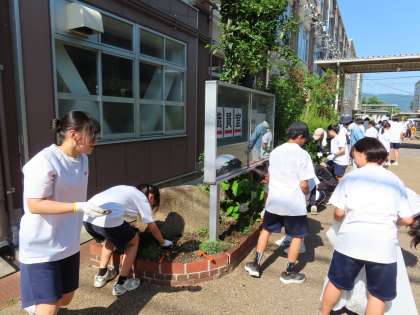校門を入った花壇やプランターも季節の花が終わったので,植え替えをみんなの手で行ってくれました。
