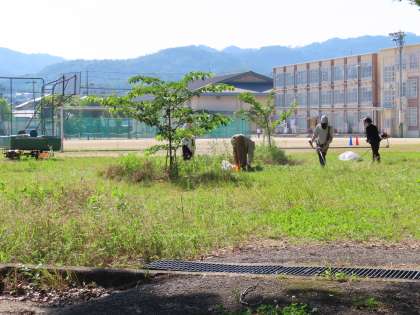 保護者ボランティアの皆さんも,機械を使って草刈りをしていただき,安全確認をしてから,刈られた草を集めてくれていました。