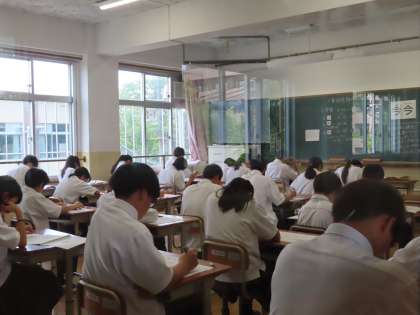 定期テストが行われていますが、登校時にはテスト勉強用のテキストを片手に、校門をくぐっている生徒が多く見られます。1年生にとっては、中学校での初めての定期テスト。3日間ひとつ一つの教科テストに集中して取り組んでいる姿が見られます。