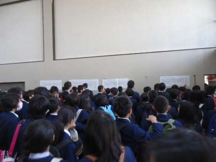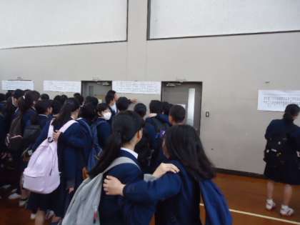 体育館に集まった生徒は、壁に貼られた「クラス発表」が気になりながらもきちんと座って待っていました。さあ、クラス発表です。一斉に各学年の発表場所に駆け寄り、自分の名前を探しました。2・3年生は1年生よりも一足早く「学級開き」です。これから1年間クラスメートとして一緒に過ごす仲間との出会いです。