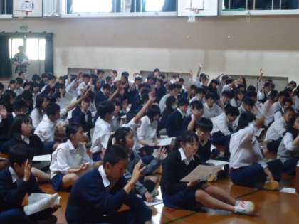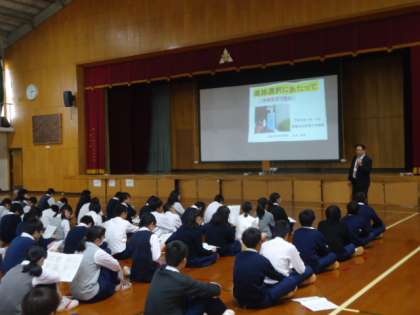 暑い体育館の中でしたが、講師の先生の「将来、大学進学を考えている人は?」との問いかけに、多くの生徒が手をあげていました。もちろん、迷っている生徒もたくさんいましたが、自分なりの「夢」・「希望」をもつことの大切さを改めて感じてくれたことと思います。