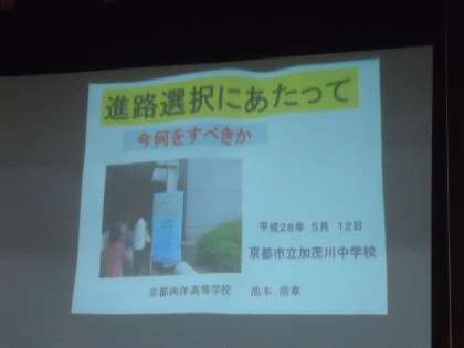 今日の6時間目に3年生は体育館で生徒対象の進路説明会を行いました。京都両洋高校からお二人の先生をお招きしての説明会でしたが、その高校の宣伝(PR)ではなく、進路選択にあたって「今」あるいは「これから」大事にしてほしい準備や心構えについてのお話でした。「今、何をすべきか」というところでは、学習面と生活面の両面から次のような内容でした。