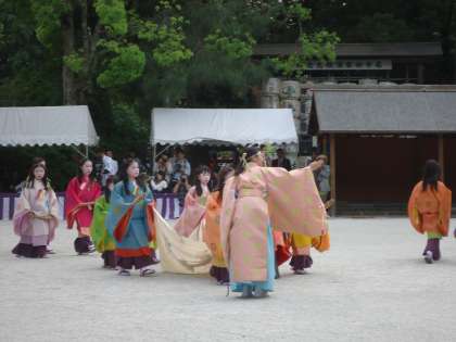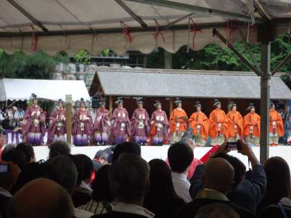 京都三大祭の一つである葵祭に、上賀茂神社からご案内をいただきました。日曜日の開催は5年ぶりというタイミングでもあり、拝見させていただくことにしました。午後2時30分になると、「二の鳥居」よりも奥の境内は一般の方が退出され、熊手で敷石がきれいに整えられました。3時30分になると、勅使(ちょくし)・舞人(まいびと)・陪従(べいじゅう)を率いて斎王代(さいおうだい)が参進されます。その後、古式にのっとり様々な神事が執り行われました。このような神事を拝見させていただくのは初めてのことであり、また上賀茂神社には宮本亜門さんを初めとする著名な方もご列席で大変驚きました。何より驚くのはこの祭が源氏物語・徒然草にも登場するということです。非常に静かな空間・ゆっくりと流れる時間の中での午後のひとときでした。