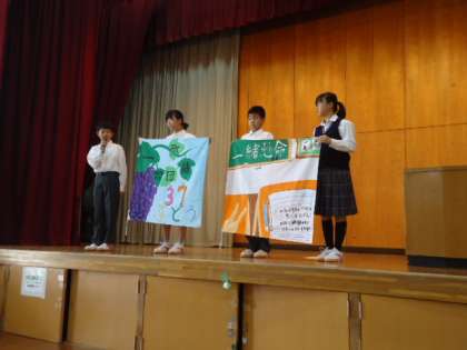 まず最初は1年生の「学級旗」の紹介です。緊張しながらも旗のデザインや旗に込めた思いの説明をしました。