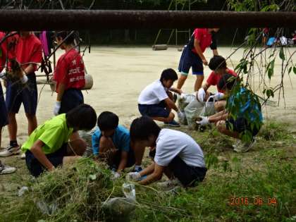 休日参観の午後は300人ほどの生徒・PTAの皆さん・教職員が「賀茂川を美しくする運動」に汗を流しました。賀茂川と校内・学校周辺の三カ所に分かれての活動です。賀茂川の河川敷は思っていた以上に美しく、ゴミらしいゴミはほとんどない状態でした。日頃から地域や行政の方が清掃してくださっているおかげだと感心しました。校内は雑草がいっぱいでしたが、みんなの力でしっかりと抜きました。雑草がなくなるとボールを探すのも楽だし、肌を刺す「虫」も少なくなり、体育や休憩時間の遊び・部活動がやりやすくなります。1時間ほどの活動でしたが、みんな本当によく頑張りました。