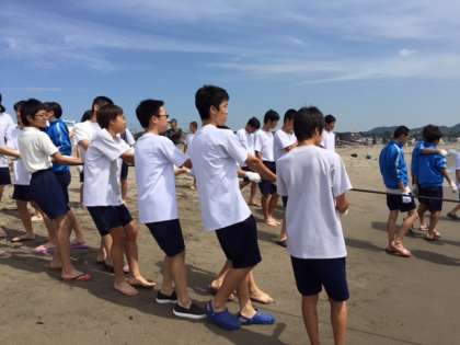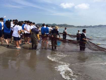 現地は晴天,全員体調良好です。地引網体験では慣れない網に悪戦苦闘しています。