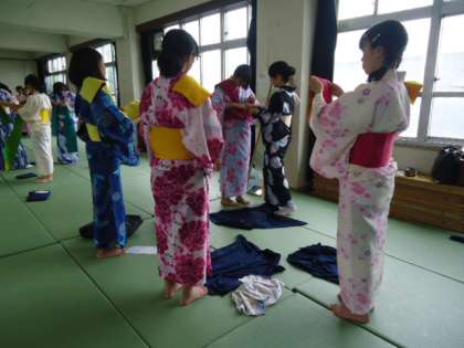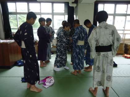 明日から祇園祭の宵々々山がはじまる絶好のタイミングに、1年生の「和装教室」を実施しました。これは家庭科の授業(服育)の一環としての学習で、着付けの専門の方をお招きしての取組です。女子生徒も男子生徒も慣れない和装(浴衣)の着付けに四苦八苦。浴衣の左が前か右が前かも知らなかったり、帯に至っては自分一人ではどうすることもできず、それでも教えていただいたおかげ・友達に助けてもらったおかげで、立派に着こなすことができました。浴衣で祭もいいけれど、浴衣で散歩・浴衣で就寝もいいかもしれませんね。