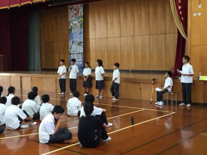 1時間目の全校集会の後は、各学年ごとに「学年集会」を行い、第1期の振り返りをしました。どの学年も生徒の司会進行で、各クラスごとに代議員が報告をします。3年生では修学旅行の思い出や夏の大会に向けての決意なども語られていました。1年生は振り返りの後、壁新聞コンクールの表彰なども行いました。2年生の学年集会は先生方の「歌」で締めくくられました。どの学年も発表する生徒も、聞く生徒の態度もとてもきちんとしていました。