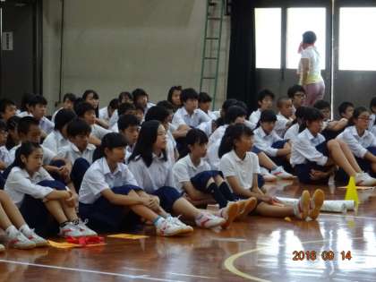 今日は2年生は、合唱コンクールの時の「学年合唱」の入退場の練習をしました。全員が体育館に集まり、先生から入場についての説明を聞きます。多くの生徒が集まっても、みんな集中して先生の話を聞いていました。歌うだけでなく、入退場も含めて練習することで、合唱コンクールに対する意識はさらに高まると思います。