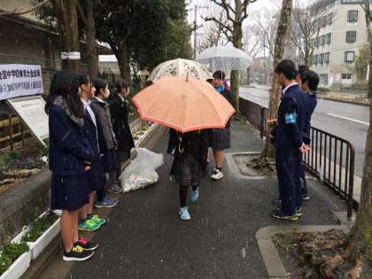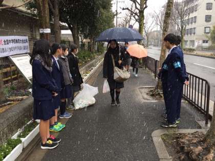 今朝も加茂川中学校周辺では雪が舞っていました。時折やんだり、強く降ったりする中、生徒会の人たちが校門前で「ペットボトルキャップの回収」と「義援金のお願い」をしてくれていました。頭やブレザーに白い雪が積もるような寒い朝でした。