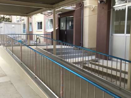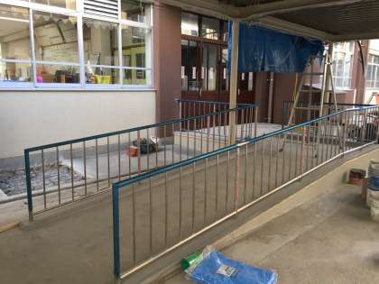 土日が明け、月曜日に学校へ来るたびに、どんどん改修が進んでいる様子が分かります。今日も校舎へ入ろうとすると、今までの古びた扉が木目調に美装されていました。また各校舎へのスロープや手すりもできていました。工期もあとわずかです。