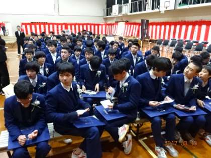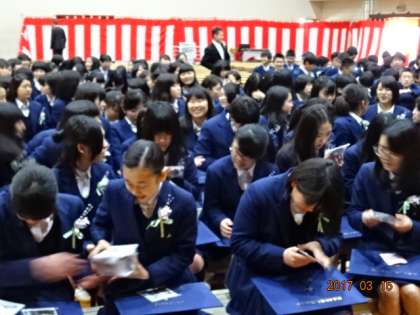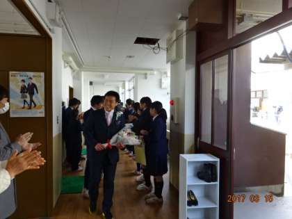 本日は卒業式です。あいにくの空模様でしたが、式場内(体育館)は心温まる雰囲気に包まれた卒業式となりました。今日は担任の先生の呼名にしっかりと返事することができました。また、壇上で卒業証書を受け取るとき「ありがとうございます」と口にする生徒も大勢いました。
