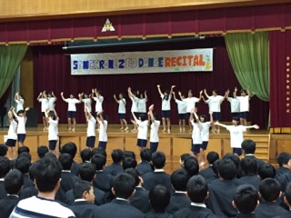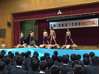 3年生は女子による「ダンス」と、男子による「シンクロ」の演技で会場を盛り上げました。青い布で「プール」を表現し、組み体操をしたり男女一緒に踊ったりとエネルギーあふれるパフォーマンスでした。そして最後は一転してまじめな表情での合唱が印象的でした。