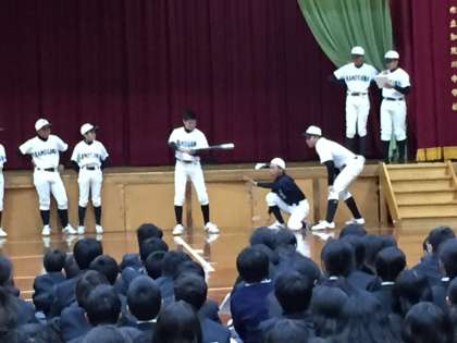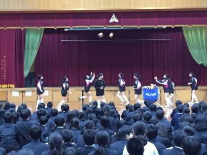 午後は体育館で「生徒会」の説明と「部活動オリエンテーション」がありました。各部とも趣向を凝らした紹介で、プロジェクターで活動風景を伝えたり、劇や「お笑い」のネタを使ったりしながら生き生きと説明していました。