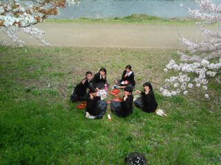 桜が残る賀茂川河岸で「昼食会」をしました。1年生はもちろん2年生は昨年は雨で行けなかったので初めての昼食会でした。春爛漫、楽しそうです。