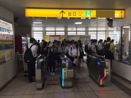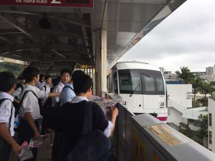 ゆいレールに乗って牧志に向かいます。モノレールの中では、お年寄りに席を譲る姿もありました。さすが3年生!