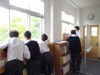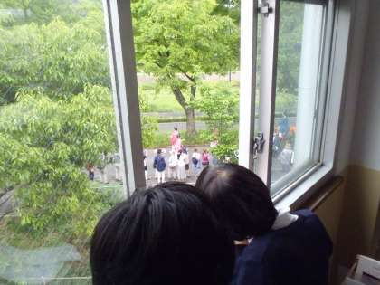 授業が終わったころ行列が通りました。校舎東側から加茂街道は目の前です。