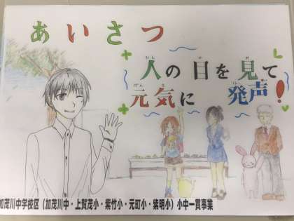 今回は「あいさつ」をテーマとしたポスターを作成し、加茂川中学校区の小中学校で同じものを掲示することにしました。中学校の美術部で作成を担当してくれました。左下の表示が「加茂川中学校区(加茂川中・上賀茂小・紫竹小・元町小・紫明小)小中一貫事業」と少し堅苦しいので、シンボルマークを作ってはどうかという意見も出ています。また、小中共通のわかりやすい「目標」や、小中の行事をまとめた「コミュニティーカレンダー」の制作も検討しています。