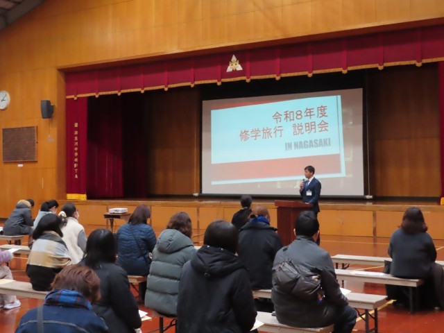 まず、修学旅行については、行き先を長崎方面とし、日程を令和8年5月19日(月)から21日(水)の2泊3日で実施する予定であることをお知らせしました。行程の概要や現地での学習・活動内容、今後の準備の流れについて説明するとともに、3年生になってすぐに取り組みや各種手続きが円滑に進むよう、ご家庭でのご協力をお願いしました。