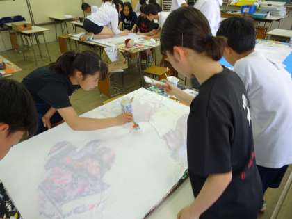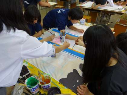 先週に引き続き家庭訪問期間中に、生徒は放課後に学級旗を作成しています。