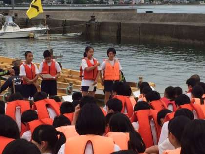 港に集合した生徒たちは,現地の方から説明と諸注意を受けた後,この後に行われるレースの説明を聞いています。勝敗を左右するのは言うまでもなく一糸乱れぬチームワークです。さて,どのチームが勝利するのでしょうか!!