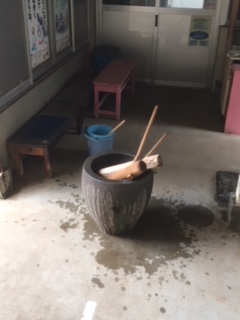 修学旅行最終日を迎え,少し蒸し暑いようですが天気も良く,生徒たちは全員元気に体験学習に取り組んでいます。ヨモギもち作りのグループの様子です。