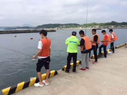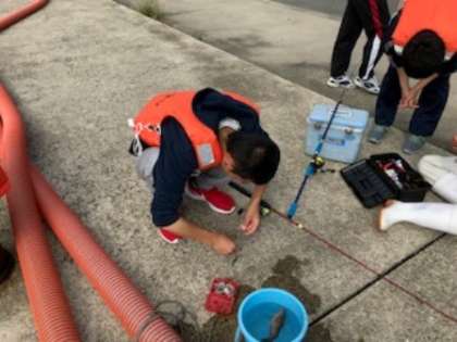 港釣り体験の様子です。安全第一,ライフジャケット着用!バケツの中には大きな魚も・・・