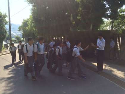 生徒会活動の一環として、生活委員会が登校時の「ハイタッチ運動」を行っています。挨拶で気持ちの良い朝をむかえています。