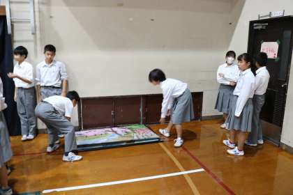 本日、6限から学習発表会の準備をしております。体育館をカーテンで区切り、掲示するためのスペースを作っております。係の生徒が作品を搬入し、掲示する作業を頑張っています。