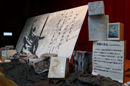 学年劇「今、君を…〜明日が来ると思ってた〜」をモチーフにしているモザイク画です。復興支援や長崎での修学旅行で学んだことを作品にしました。