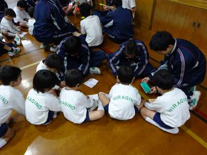 園児が体育館に入ってくると「かわいい!!」と歓声が上がっていました。最初、少々緊張気味だった園児達も、3年生と遊んでいる間に、気持ちがほぐれ大はしゃぎ。中学生の中には、元気に走り回る園児達のパワーに押され気味の人も・・・。それでも、みんな、園児のすてきな笑顔に和みながら、生徒も優しい笑顔ですごした時間でした。