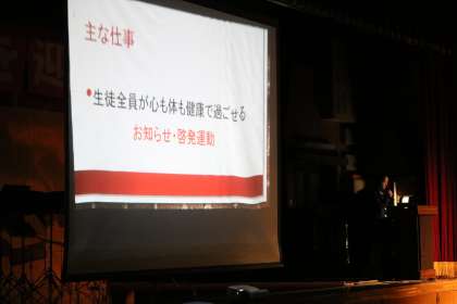 委員会活動の紹介や部活顧問の紹介がありました。先生方の返事は気合いが入っていました。