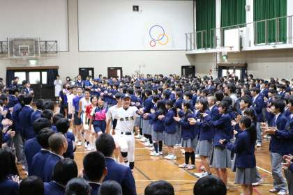 認証式に引き続き、春体にむけた壮行会がもたれました。各部の部長やキャプテンが入場し、大会に向けた抱負を述べました。文化系部活動の各部長から激励の言葉がありました。学校長からは大会に向けて「全力」・「平常心」・「感謝」のメッセージが送られました。各部の健闘を祈ります。